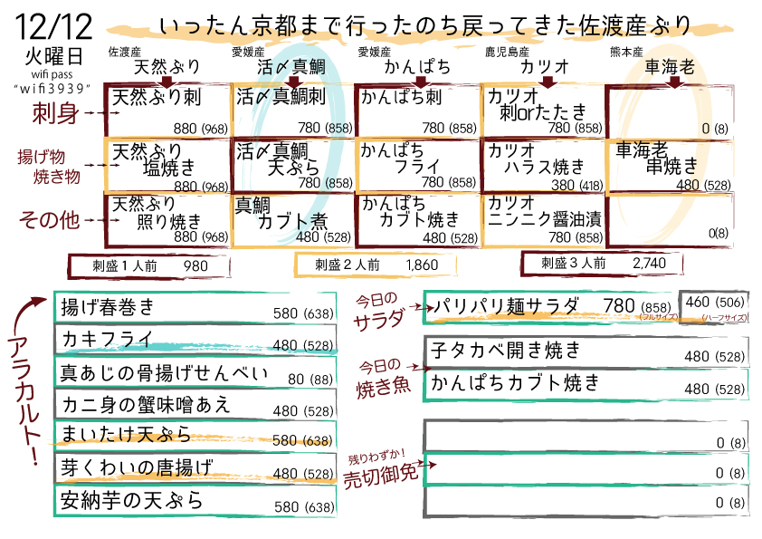 さておき本日のおすすめは【能登産 天然ぶり】もしくは【鹿児島産 かつお】。