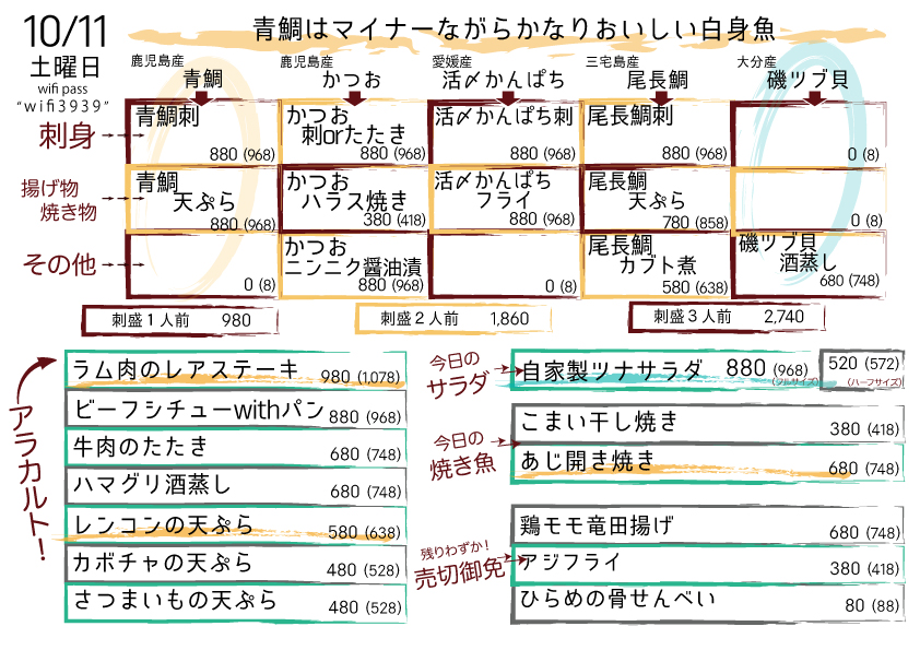 しばらくマイナーな魚類2枠でやってみて、また南蛮漬けを多用するようであれば現在のスタイルに戻す、という形でやってみますので、マイナー魚類を多めに食べたい方におかれましてはとりわけ青鯛・尾長鯛をぜひ。