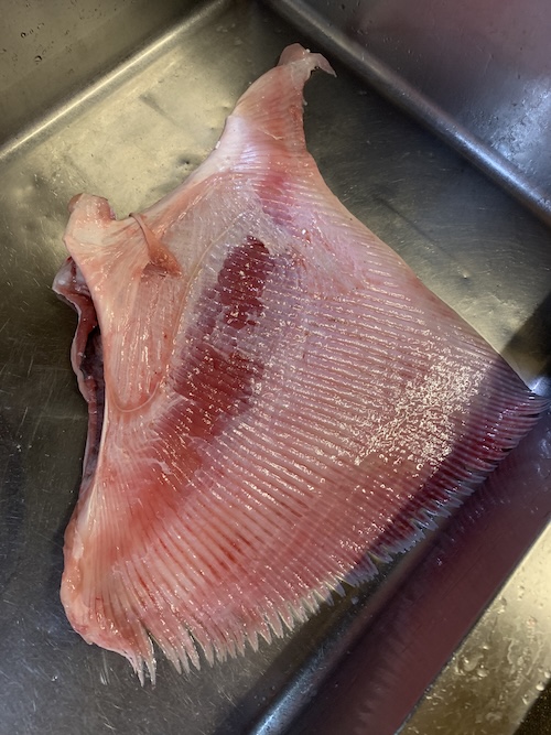 これを干すとよく居酒屋で提供され、当店もその例に漏れず常時提供しているいわゆる「エイヒレ」になる、その干す前のもの。