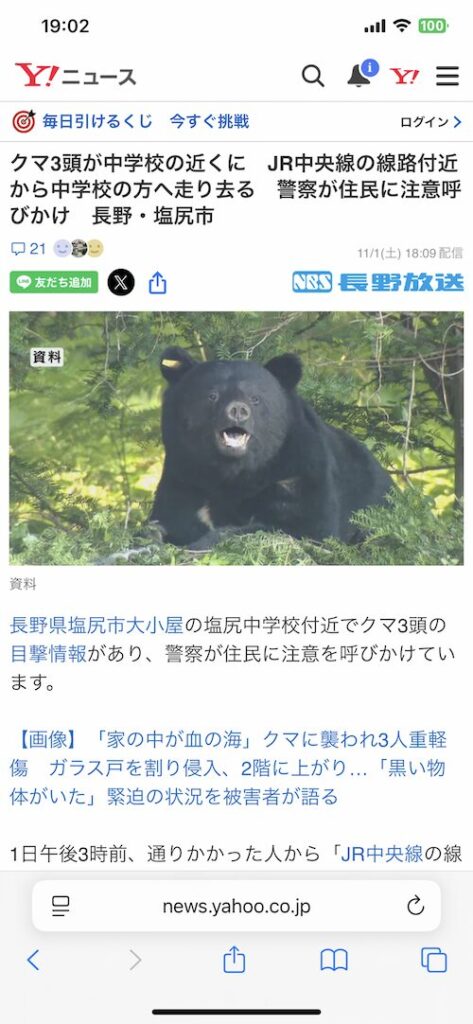 記事中にある「塩尻中学校」は私の母校、そしてその近辺は父と実家の犬の散歩コースになっているので、川崎に住んでいる私にできることは父が柔道教室に通い「熊を巴投げするタイプの老人」に進化するよう促すこと、ジビエを売って熊の生活環境の改善を助けること、そして早めに喪服をクリーニングに出しておくことくらいしかないぜ!!ということです。