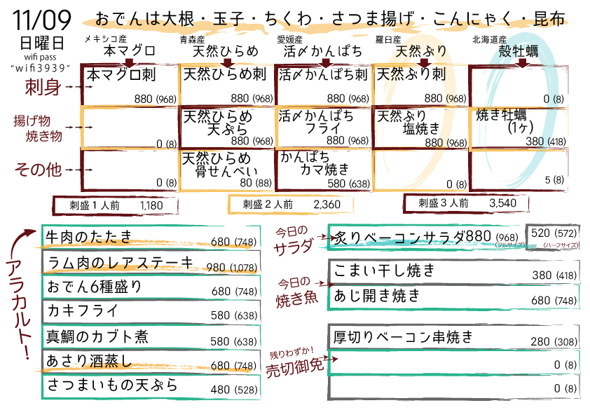 加えて今日は【おでん 680】もありますので、このなんのイベントもない11月中旬に近所の飲み屋でゆっくり過ごすに良きメニューの並びになっているのではないか。
