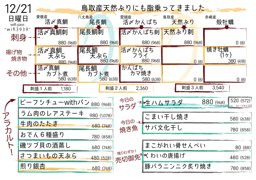 水曜に貸切、金曜に忘年会多数、土曜も忘年会さらに多数、の絶好調で来て、今日この時点で予約がほぼない。