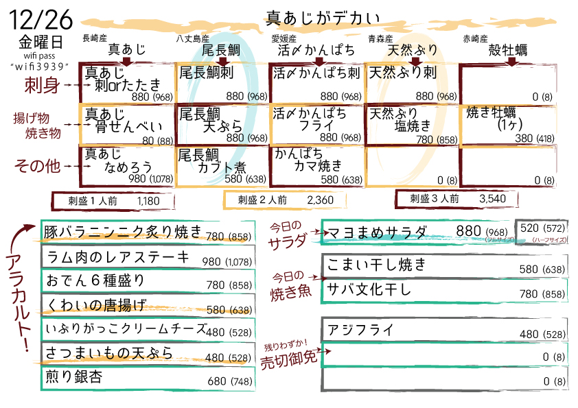当店においては金土日通常営業、月曜が平素貸切専用なところを臨時通常営業、開けて火曜日が最終営業日となって今年の営業が終了となります。