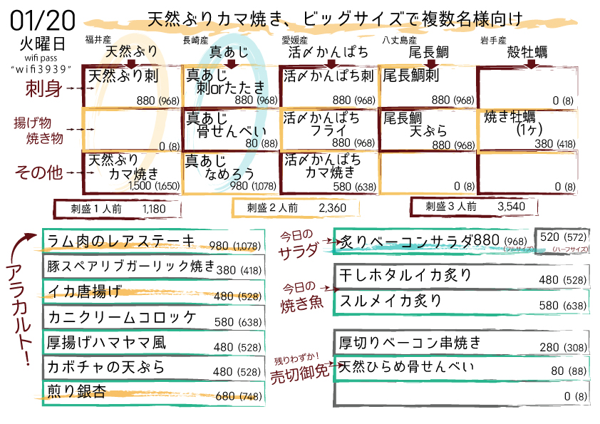 今日などはかなり寒くゆっくりお過ごしいただけること請け合いですので、熱燗などお召し上がりいただきつつ尾長鯛をご一緒にぜひ。