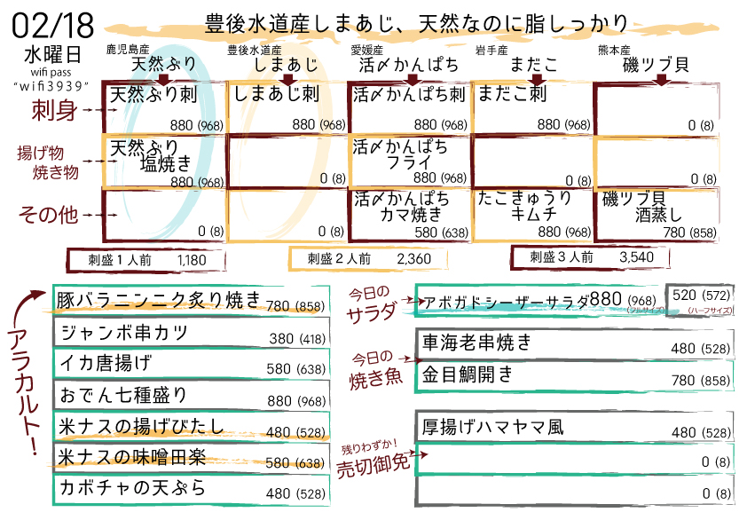 元々は昨日のメニューにあったように【赤崎産 殻牡蠣】の焼き牡蠣と並立させて【国産 貝類】として売っており、昨日今日とその形で売るつもりだったので「メニューに書く機会もないし磯ツブの産地は聞かなくていいか」として聞いていない。が、昨日うっかり殻牡蠣が全部売り切れたので今日のその枠は磯ツブが独占しており、ゆえに「確かいつもは熊本産だった気がする」で熊本産となっております。