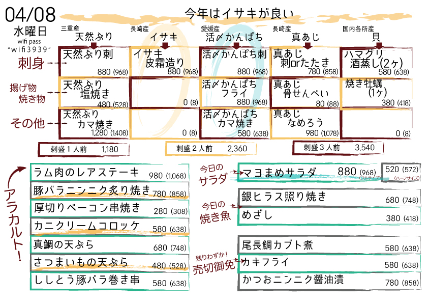 その際には本日のオススメが【長崎産 イサキ】である旨お伝えください。